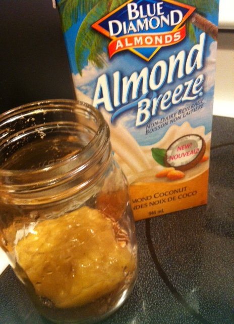 - Once it’s hot enough for your liking remove the jar from the water and your going to add the 1 TBSP of almond butter into the mixture.