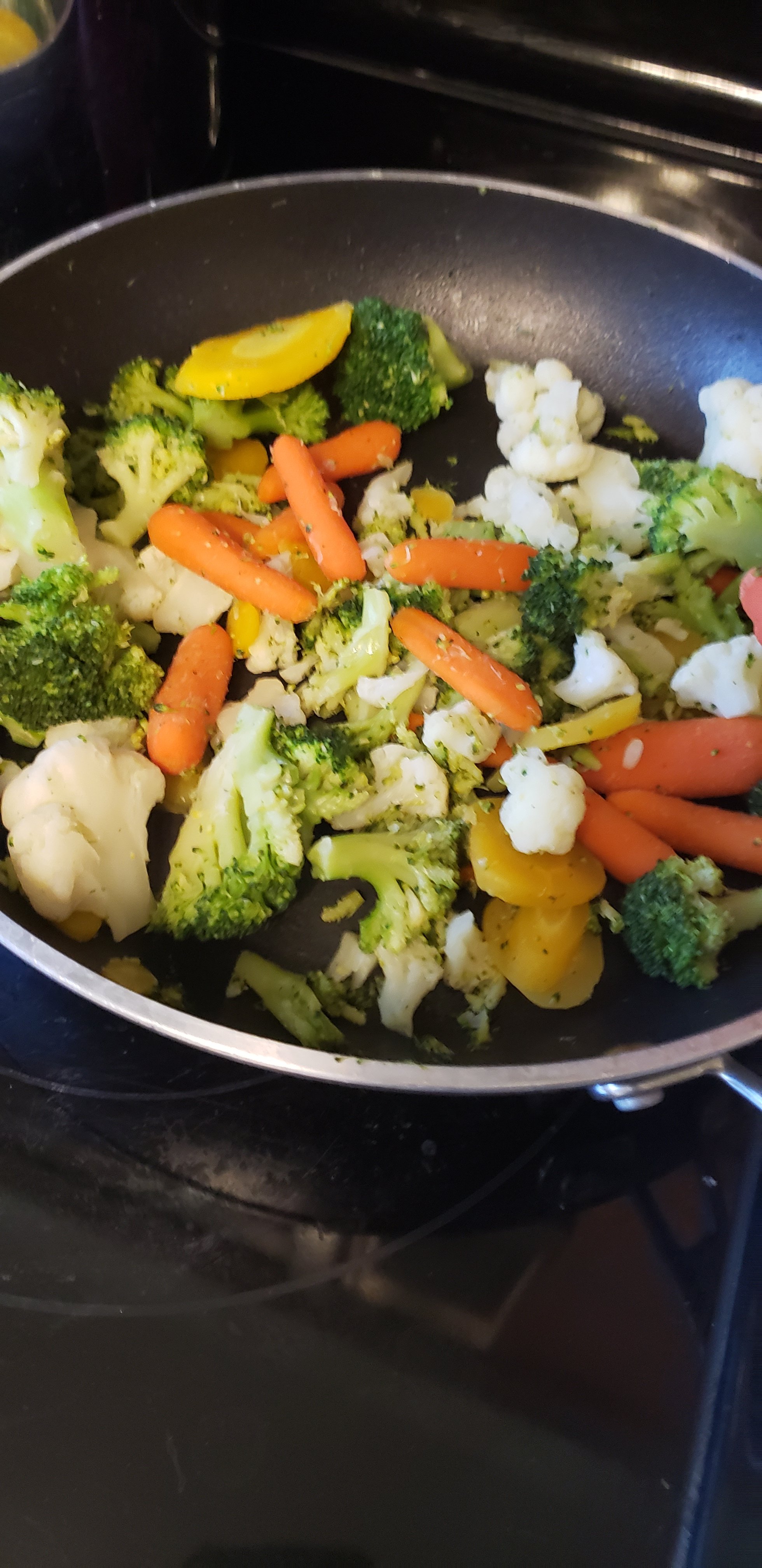 2. Cook up veggies of choice in a frying pan using water instead of oil. I like to use a mix of broccoli, cauliflower and carrot most often.